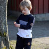 Hvit langermet overdel med applikasjon på brystet. Ett hjerte i gullglitter, og ett i støvet grønt med gullprikker, begge hjerter er brodert på med gulltråd.